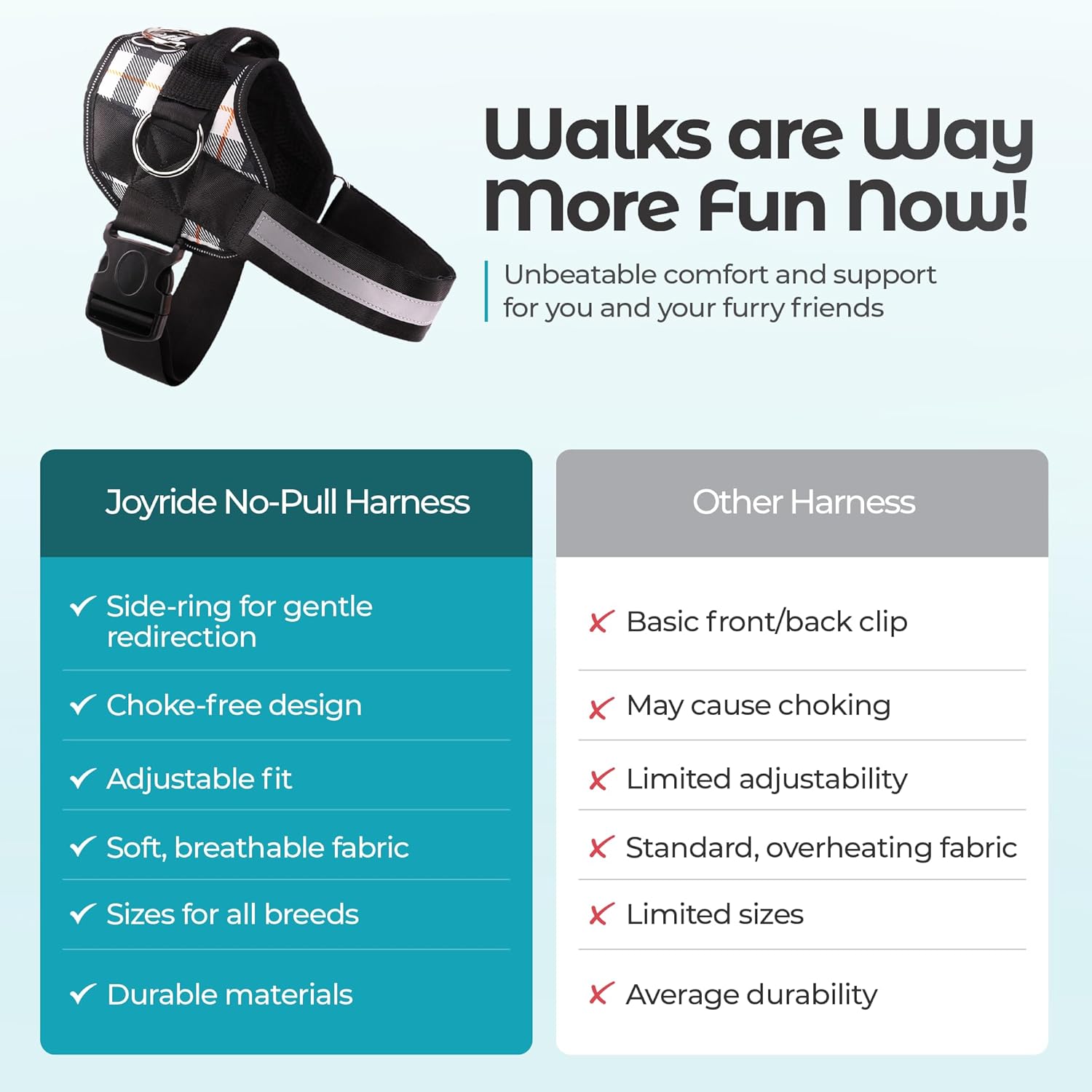 - [Unmatched Durability]: Crafted with your dog's safety at its core, and a lifetime of durability, the Joyride Harness is sturdy and built to last the test of time and energy. Featuring a sturdy Emergency Safety Handle, an advanced buckle closure system, and reflective material and stitching for added safety, our easy walk dog harness is built to ensure your adventures are safe, day or night.