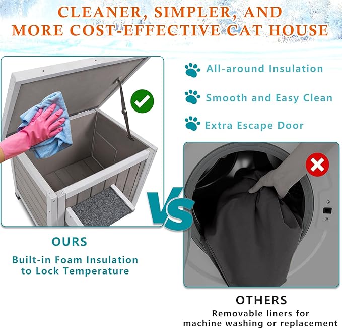 - Lock in Comfortable Temperature: Crafted with a 3-layer insulation system (Fir wood, Wooden Baord, and a 0.4" solid Polylon Foam core layer), this shelter protects cats from extreme outdoor conditions.The wood boards are smooth and no splinters, and making cleaning easy, better than washing machine.