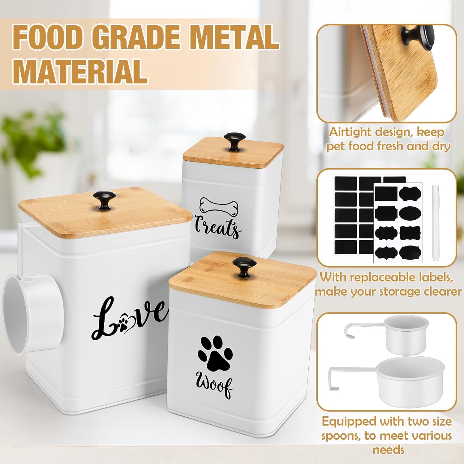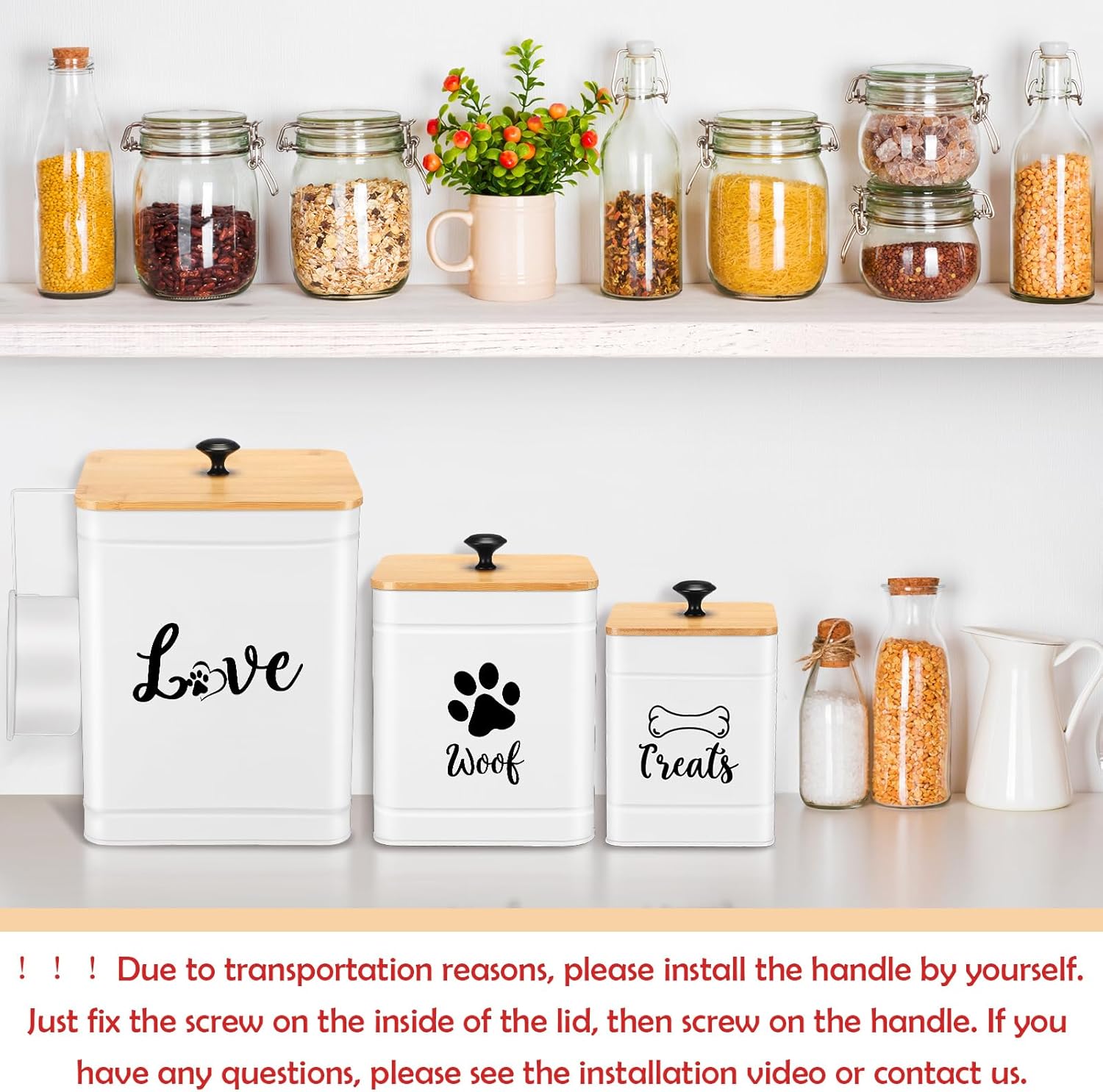 Metal Dog Treat Containers Set of 3 with Bamboo Lids and Spoon Airtight 7+3+2 lbs Dog Food Snack Jars with DIY Labels Big Pet Cookie Storage Jar for Kitchen Counter(White,Modern)