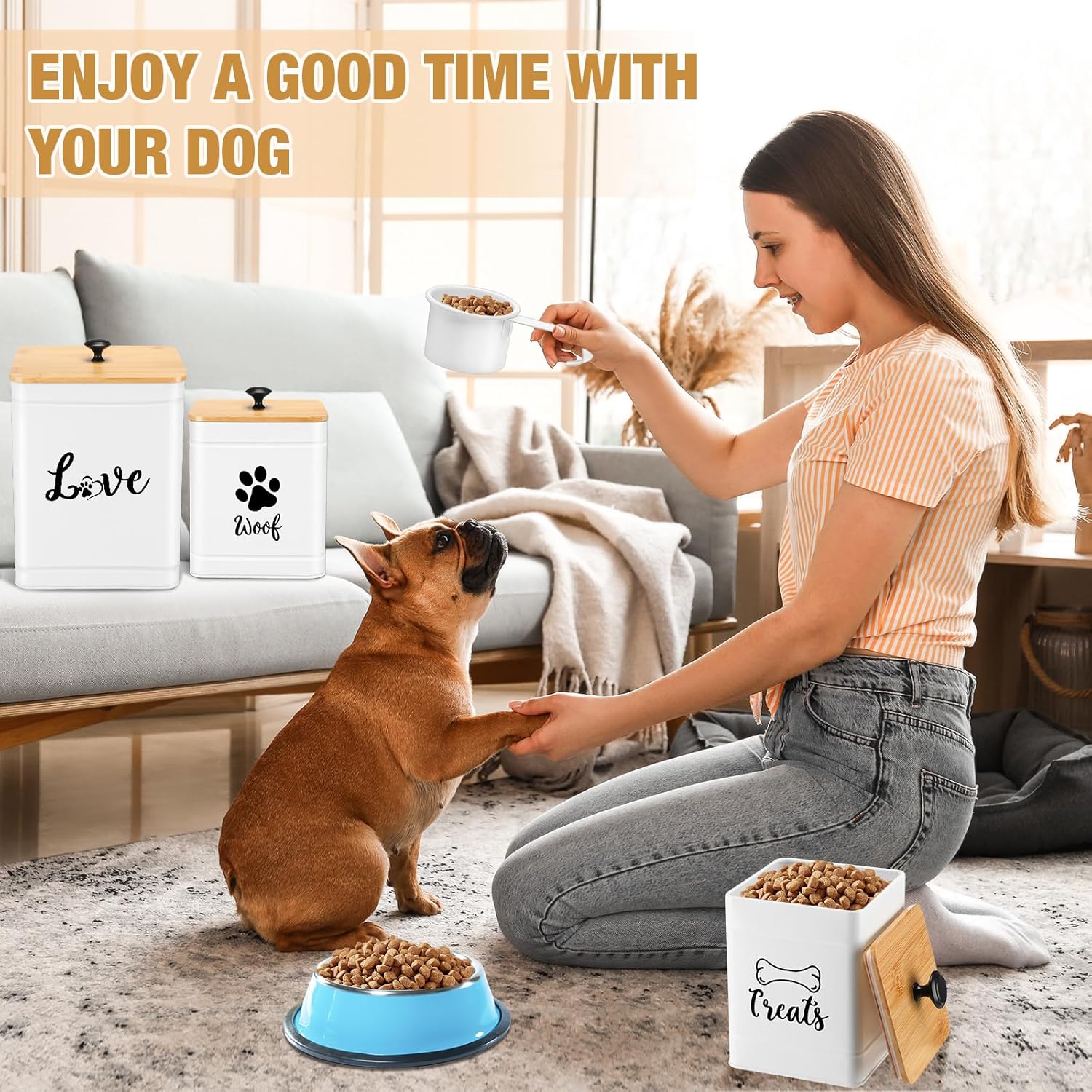 - Versatility: these cute design dog food tins are nice for your kitchen, office, pet station, console table or anywhere; The small size dog snacks jar in the set is easier to carry, you can take it out to play with your pet; Each container is suitable for dog cookie, bone, dry or wet food, snack, teething stick, or treat storage