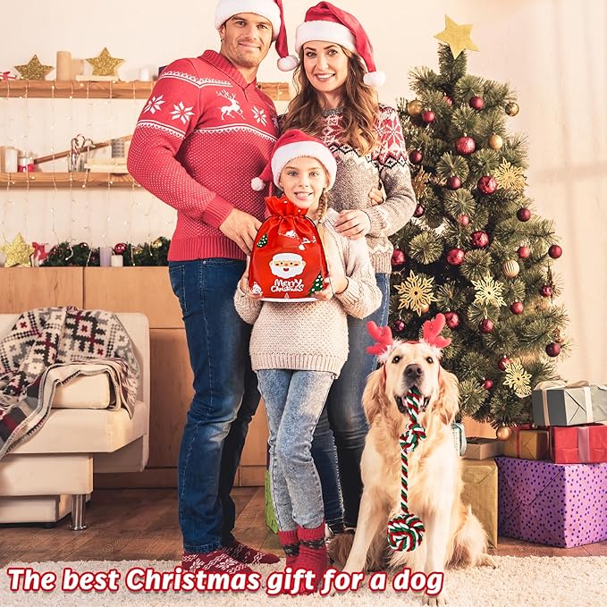 - 9 Pack Dog Christmas Toys: Packaging includes 4 dog rope toys, 2 rubber toys with cotton rope, 1 plush squeaky dog toys, 1 squeaky balls and 1 christmas gift bag. This set of Christmas dog toys is perfect as a Christmas gift for furry friends