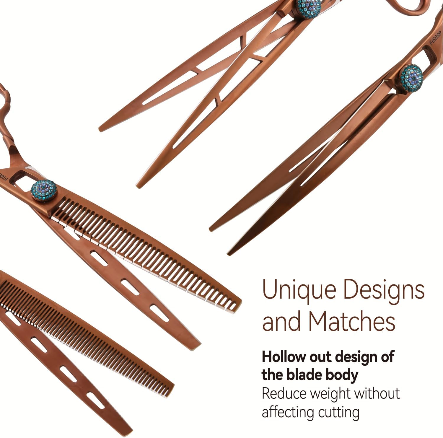 - π[Fashion Design and Matching] The dog grooming scissors adopt vacuum electroplating titanium alloy technology, chocolate color, primitive simplicity, elegant, and stable. High precision CNC screws with blue artificial diamonds embedded on the surface, like the eyes of God, dynamic and energetic. Every time you open and close the FOGOSP dog scissors, it feels silky smooth like enjoying chocolate.