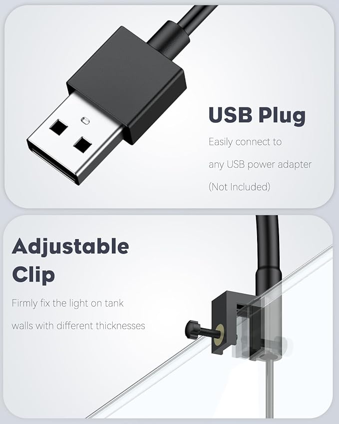 - Easy to Use: Work best on 1 to 5 gallon fish tanks! With a 3-foot long USB cable (adapter Not included), the DC-powered aquarium lamp can work uninterruptedly across the day. Featuring a flexible gooseneck, it can be twisted to shine at any angle