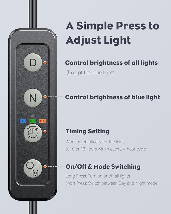 - Auto On/Off: With a built-in timer, the clip-on fish tank light provides 3 optional lighting durations: 8 h, 10 h and 12 h (Only work during the first 8, 10 or 12 hours within 24 hours). Perfect for creating a natural environment