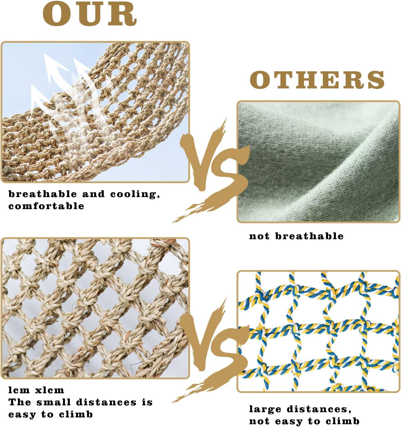 - Durable & Comfortable Design: Crafted from a hand-woven seagrass mat and supported by sturdy wooden sticks, this hammock offers both durability and comfort. The breathable mat creates a cozy resting platform while also encouraging small animals to climb.