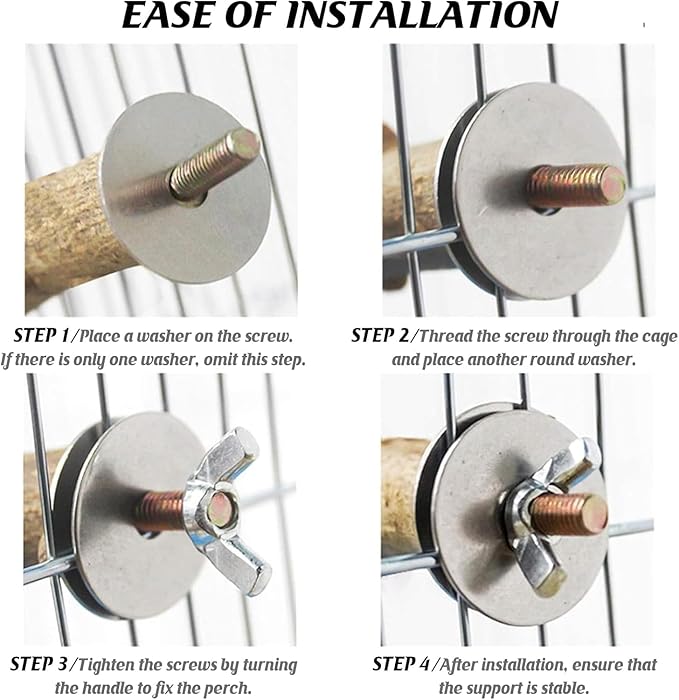 - [Simple Installation]: Each cockatiel perch is equipped with a metal wing nut and built-in bolts, just clip the bracket or platform to the bird cage with two pieces of metal washers and tighten them with screws to fix the bracket and platform stably to the bird cage, no other tools are needed
