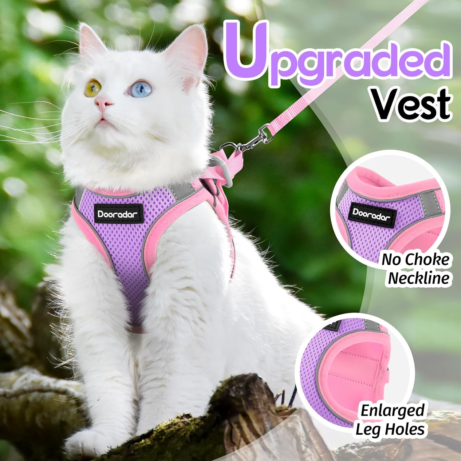 - Secure Control - This escape-proof cat harness has a high-quality back D-ring for leash attachment. It includes a strong, tear-resistant leash with a 360° swivel clip to prevent tangling and let your cat move freely.