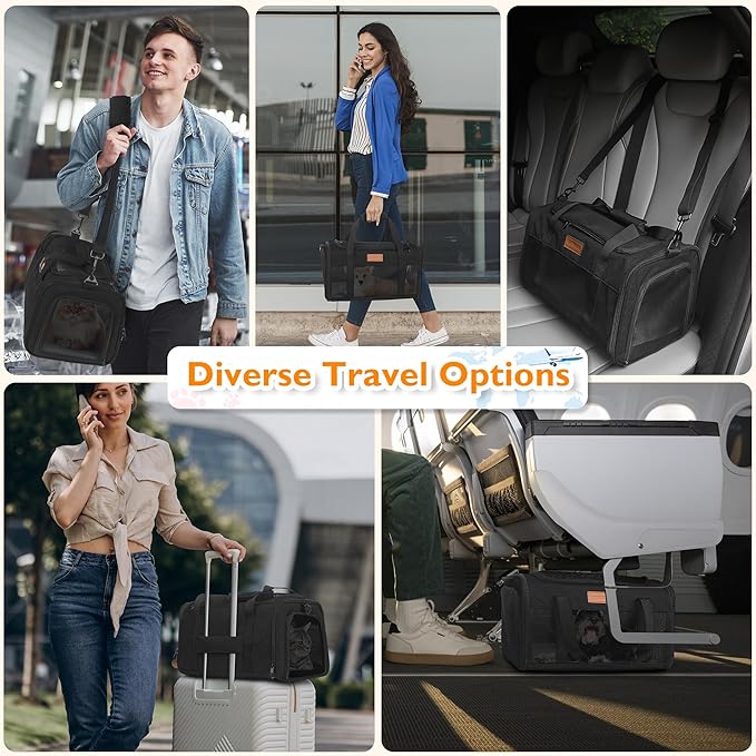 - DURABLE, SAFE & WATERPROOF: Crafted from high-quality, waterproof fabric, the PETUX cat bag carrier offers protection against the elements. It has a safe leash and a compact design that fits under the seat, allowing you to take your pet with you on your flights without worry. The top opening makes it easy to access your pet and provides comfort during travel. So the TSA-approved pet carrier in the cabin is also easy to wipe clean, making it ideal for frequent travelers