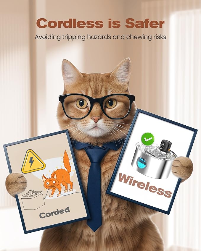 - New Pet Drinking Experience - The cat water fountain wireless offers fresh drinking water anywhere without cords, whether in the playroom, kitchen, living room, or windowsill. It encourages your furry friends to drink more while avoiding tripping hazards and chewing risks, ensuring safe hydration.