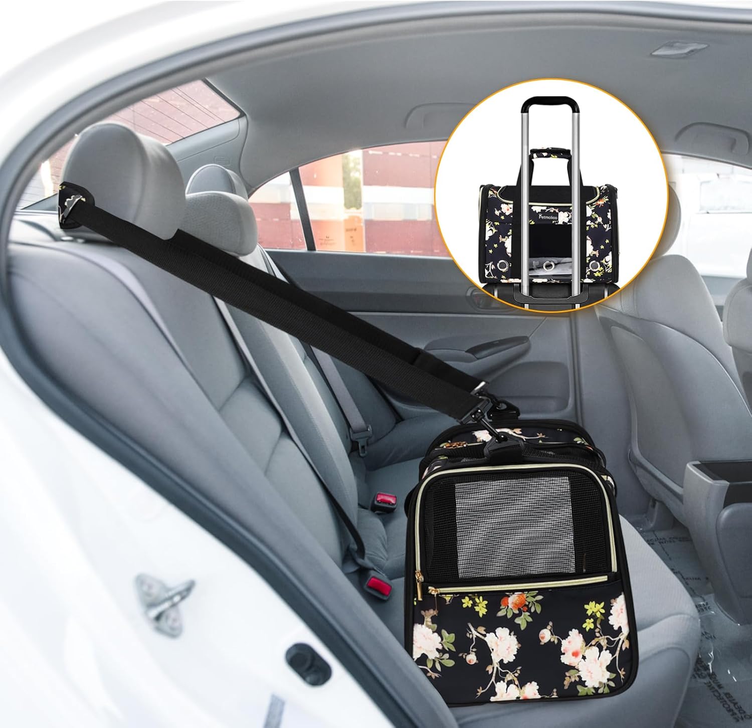 - Material & Pockets: Cat travel carrier is made of sturdy nylon with adorable floral pattern, unique and stylish. There are two pockets: the side pocket with zip closure for cat treats storage; the other on the back for phone, cards. Comes with shoulder strap and a built-in safety belt.