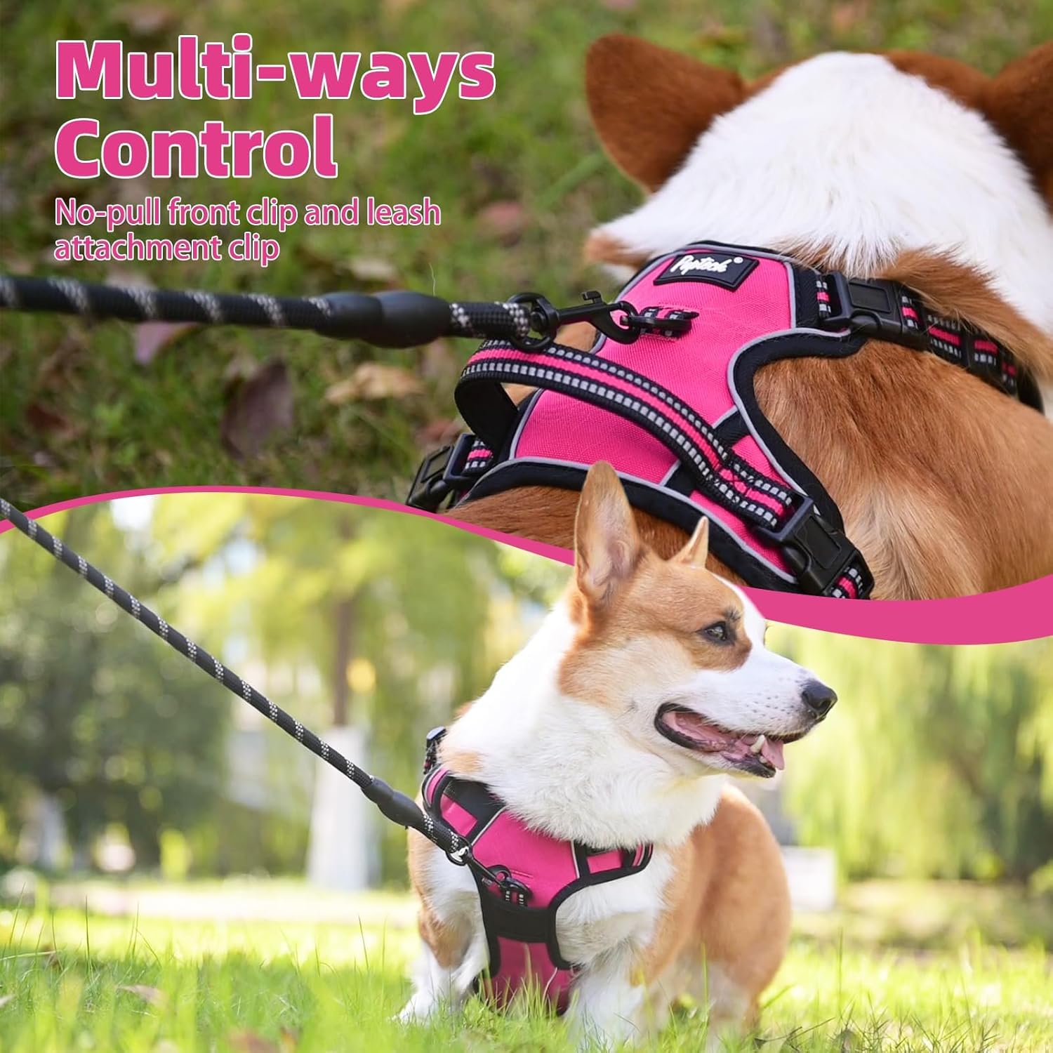 PUPTECK No Pull Dog Harness for Large, Adjustable Reflective Dog Harness with Handle Easy Control, Comfortable Soft Padded Pet Vest Harness for Large Dogs, Fuschia L