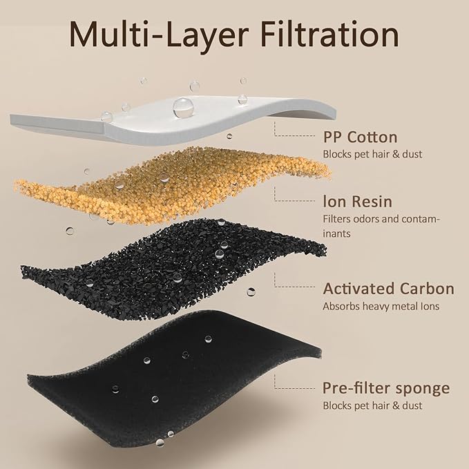 - 【4-Layer Vertical Filtration】With VOLUAS new version filter, it increases the amount of filtration material and has better filtration. One-way circulation filtration ensures thorough purification, providing pure and fresh water for your furry friends.(The filter element needs to be replaced regularly)