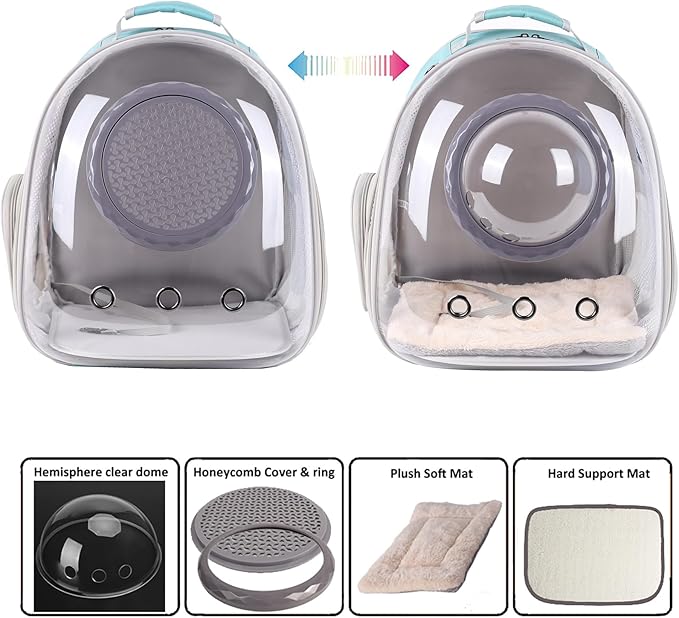 - Mechanism Dome Design: A built-in mechanism on bubble window, features switchable accessories between hemisphere clear bubble dome and honeycomb cover for better ventilation. Leave the cover idle and just mount the locking ring to have a giant hole in size of 6.2" / 15.7 cm, to allow pet's head to stick head out for easy breathing ever.