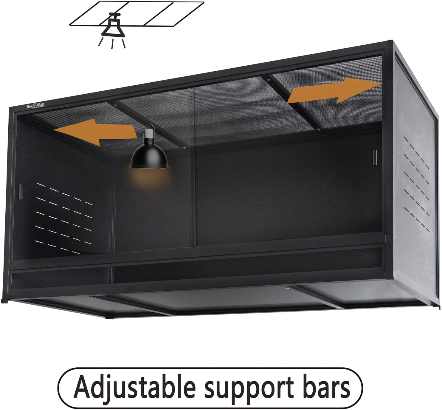 - 【Sturdy PVC Enclosure with Support Bars】: Equipped with support bars on the top screen, Toxirium reptile tank ensures secure placement of lighting fixtures without the risk of falling. The bottom panel also features support bars, guaranteeing stability even when adding decorations weighing up to 104 lbs.