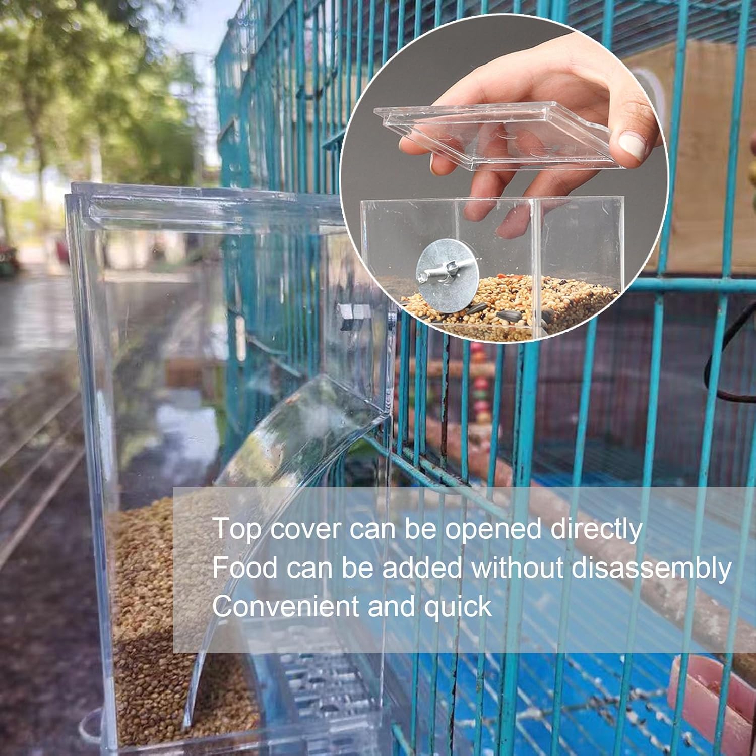 - Acrylic Parakeet Feeder: Transparent Cage parrot feeder is made of rugged acrylic with a non-slip bird perch that allows the birds to stand comfortably while feeding; The top cover can be opened directly, and food can be replenished without disassembly; Can be installed inside or outside a square bird cage