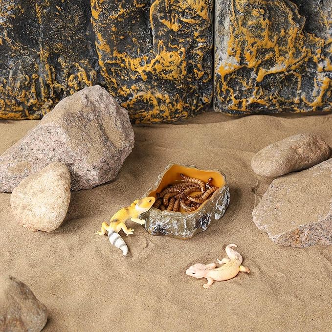 - Unique lizard food bowl - This reptile food dish features a realistic stone texture, can perfectly blend into various styles of aquarium or terrarium, whether this is a tropical, jungle, or desert themed tank, this reptile food bowl will add a touch of nature to your pets’ life. And the wide thick bottom also ensures the stability, no matter what your reptiles did, this lizard food bowl won’t be tipped over or pushed around easily.