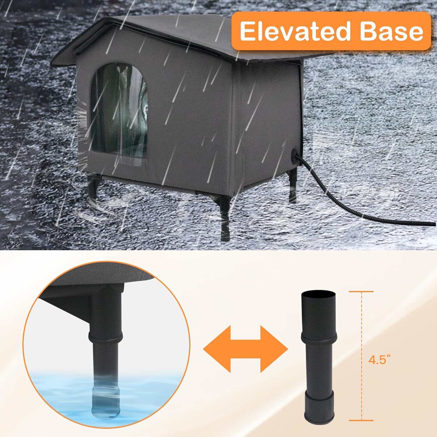 - 【Elevated Base】: Keeps the heated cat house off the ground to prevent moisture buildup and provides better insulation.Also elevated base of cat house outdoor prevent mud,rain, snow influence inside of winter cat house.
