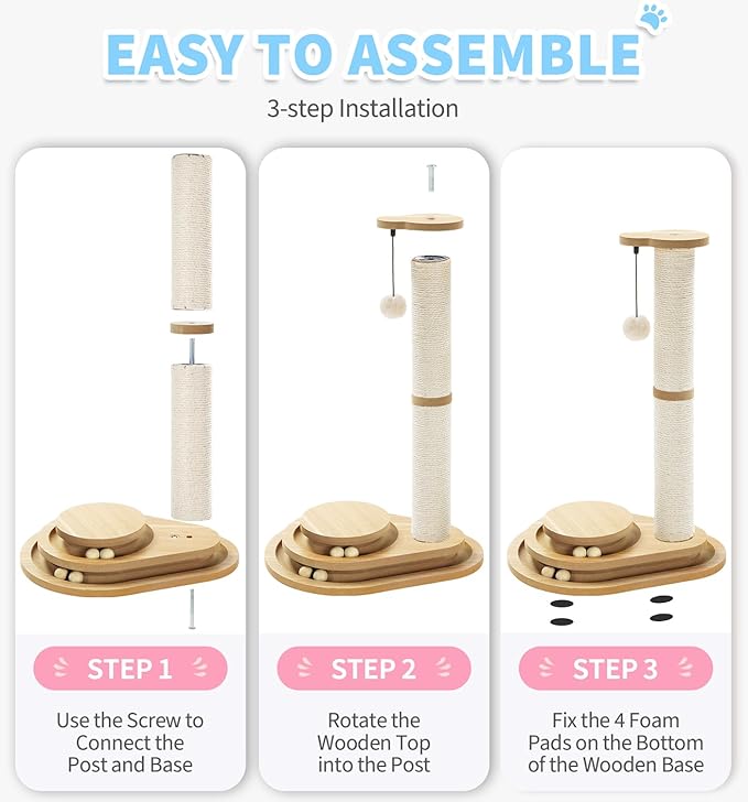 - 【3-Tier Cat Toy Board】:The cat scratchers pole is designed with 3 levels of tracks and 4 moving balls to attract kitty’s attention! Your cat will adore batting, swatting, and pouncing the playing balls as they entertain their natural instincts to hunt.