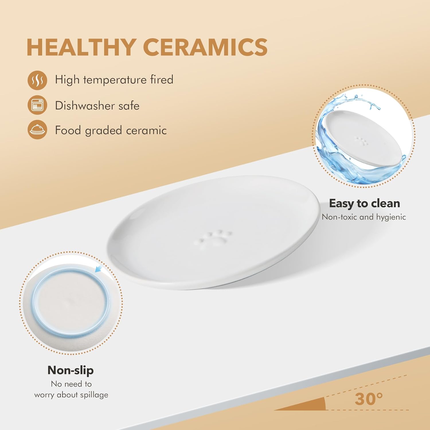 - Healthy and Anti-Slip: Loaded by food grade lead-free ceramic bowls for healthy use. Free of lead and cadmium. High temperature ceramic,non-toxic harmless,no smell,durable. Cat bowls with anti-slip strip prevents bowls from sliding while your pet eating.