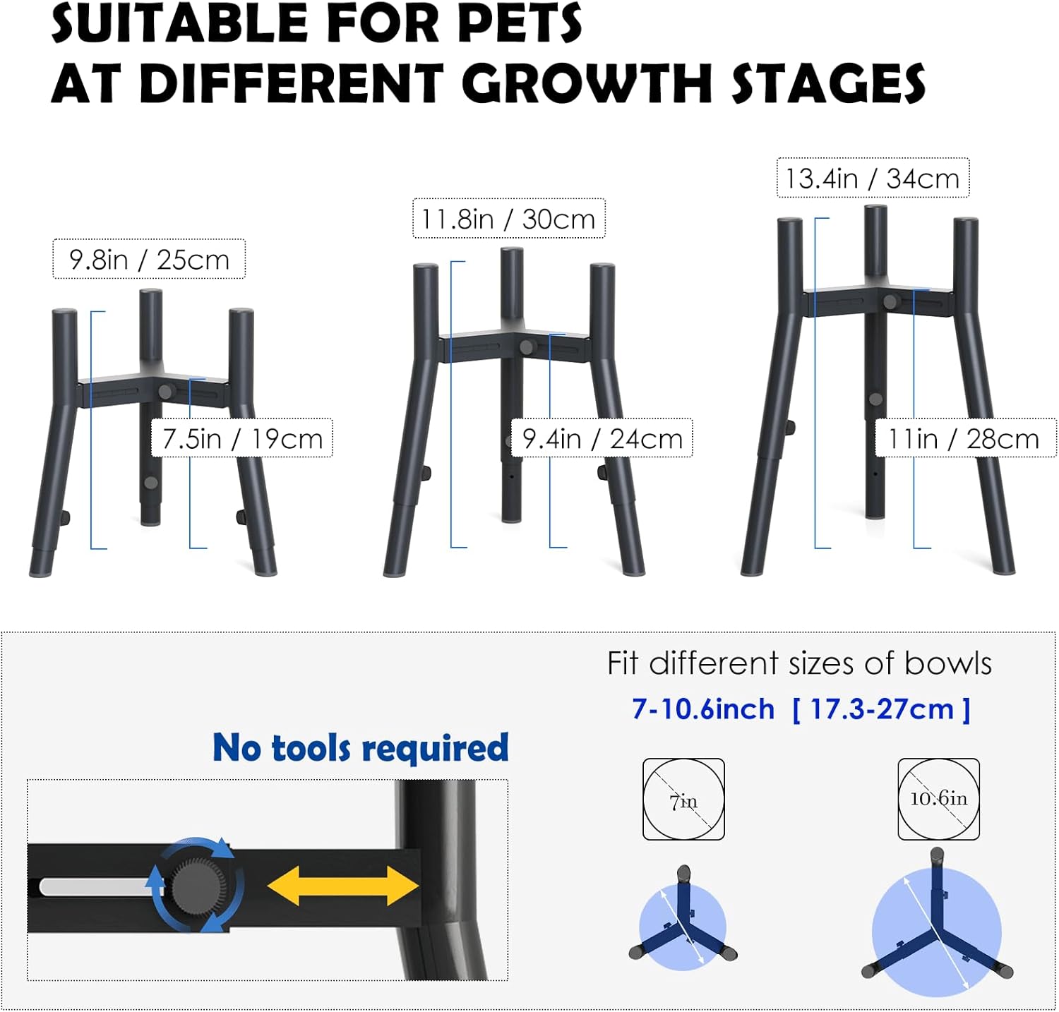 - 【Adjustable Height & Width】- TIDANT Raised dog bowl has 3 adjustable heights (9.8in, 11.8in, 13.4in) to set the right height for your dog. To use, simply place the bowl into the dog food stand's track, determine the proper inside diameter and tighten the bolt to lock the width.(Fits 7-10.7" width dog bowls) Easy to tighten and loosen without tools. Suitable for medium to large dogs, or dogs in the growth stage, accompany then from puppy to full grown.