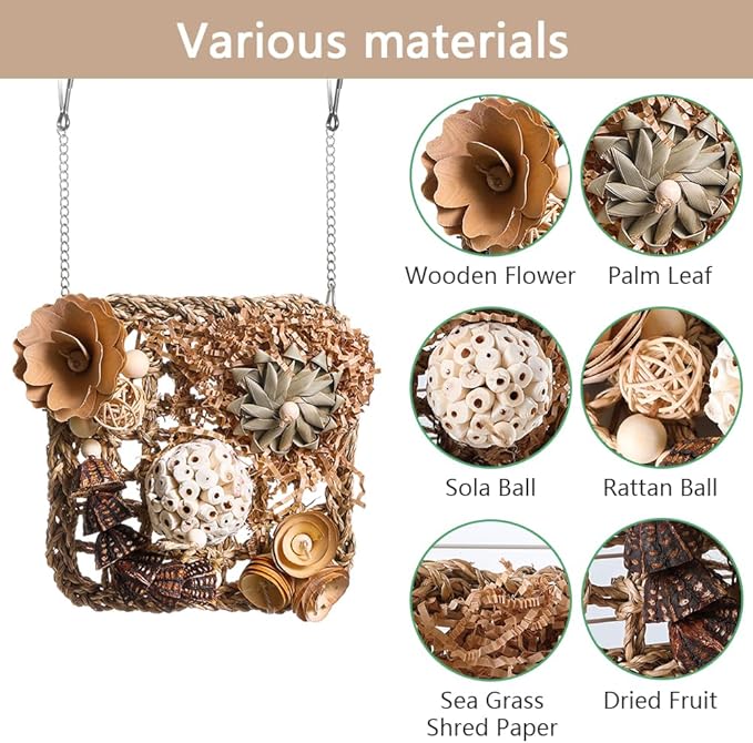 - SAFE MATERIAL: This foraging toy for birds is made from non-toxic, natural materials including wood, sea grass, paper, and dried plants, and comes with metal hooks. It is free of additive chemicals, ensuring your bird's health and safety while it enjoys chewing.
