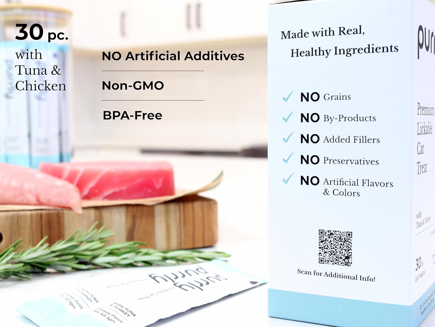 Purrly Lickable Cat Treat Healthy Human-Grade Tuna & Turkey with L-Lysine & Astaxanthin for Immunity (30 Count) Soft Healthy Low Calorie Hydrating Interactive Snack