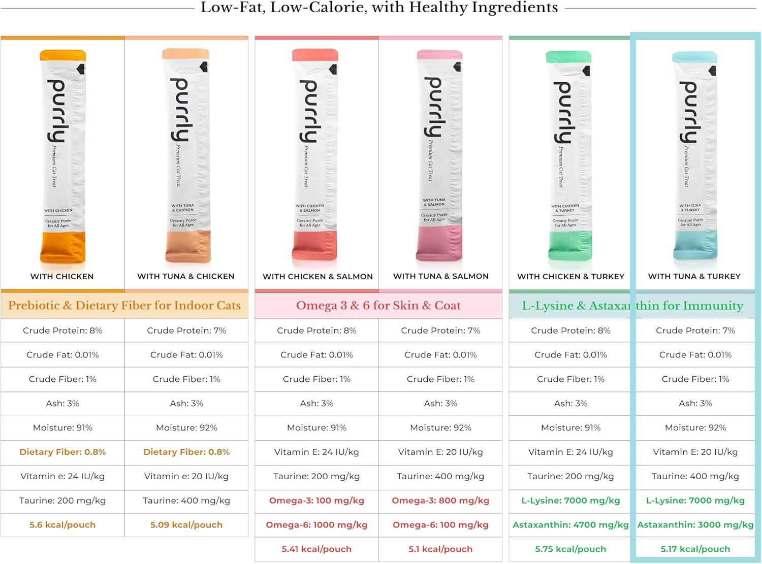 - LOW CALORIE - Purrly treats are formulated to be low in calories compared to traditional dry treats. Less than 6 calories per serving. This makes them a guilt-free way to reward your cat while helping them maintain a healthy weight. The lower calorie content allows for easier portion control, which is crucial for cats prone to overeating or weight management concerns.
