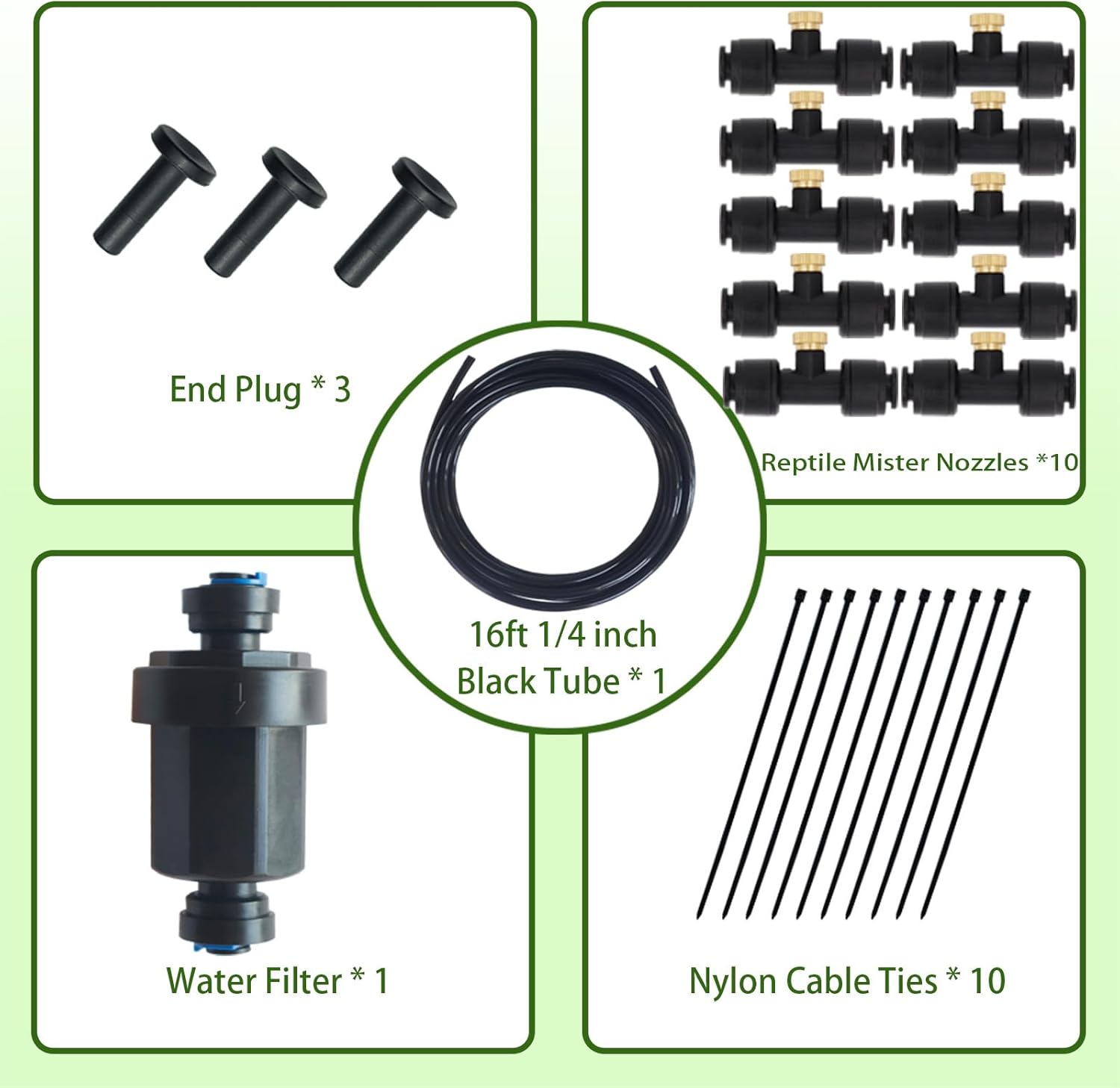 - Premium Accessories Package: Our product includes 10 reptile mister nozzles, along with a 16ft black tube, 10*nylon cable ties, 5 brass plugs, 3*end plugs, and a water filter, offering everything you need to upgrade or customize your reptile misting system setup