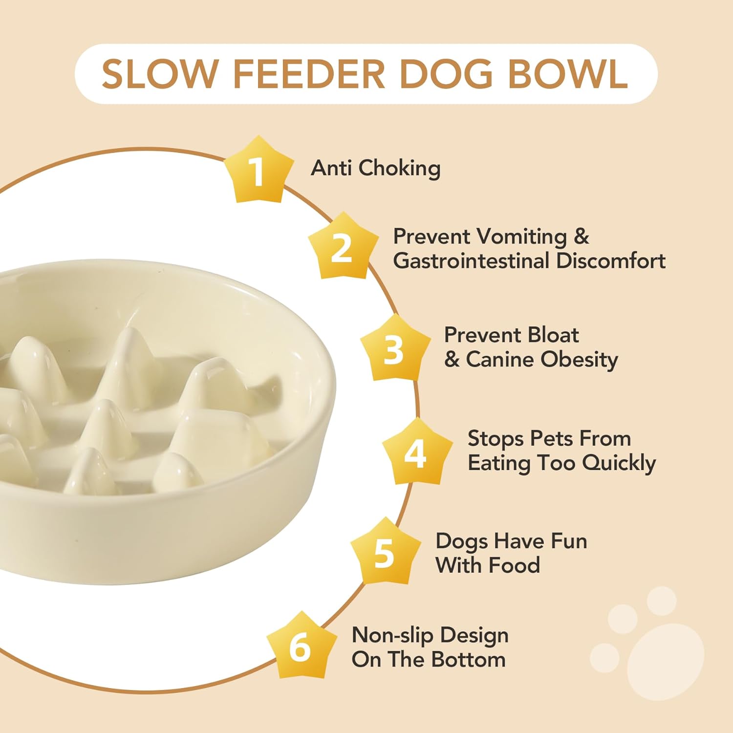 Ceramic 1.2 Cup Dog Bowl Slow Feeder, 7.3 inch Slow Pet Food Dish for Medium and Small Dog, Stop Bloat, Preventing Choking(Single Bowl, Beige)