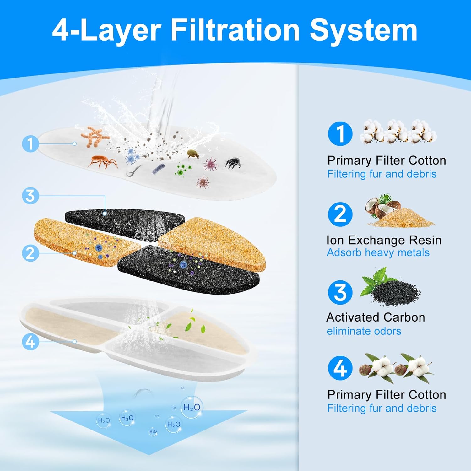 - FILTRATION: Activated carbon for odor removal;Silver ions and Ion exchange resin to remove heavy metals and soften water;Non-woven fabric for capturing pet hair and impurities;Integrated pump sponge for further debris filtration to prevent clogging
