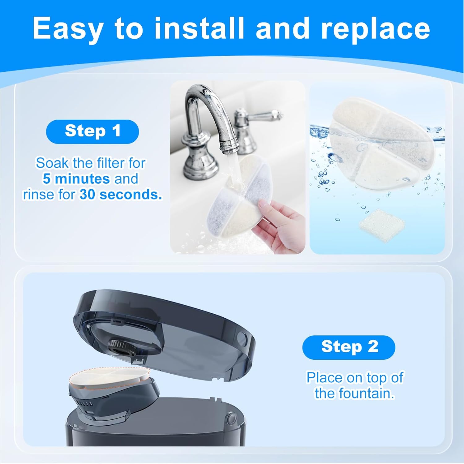 - REPLACEMENT: Soak the feel needy pet water fountain filter or 5 minutes and rinse for 30 seconds before use. We recommended replacing the filters every 2 weeks. If you have multiple pets, please clean the fountain and change the filter more often