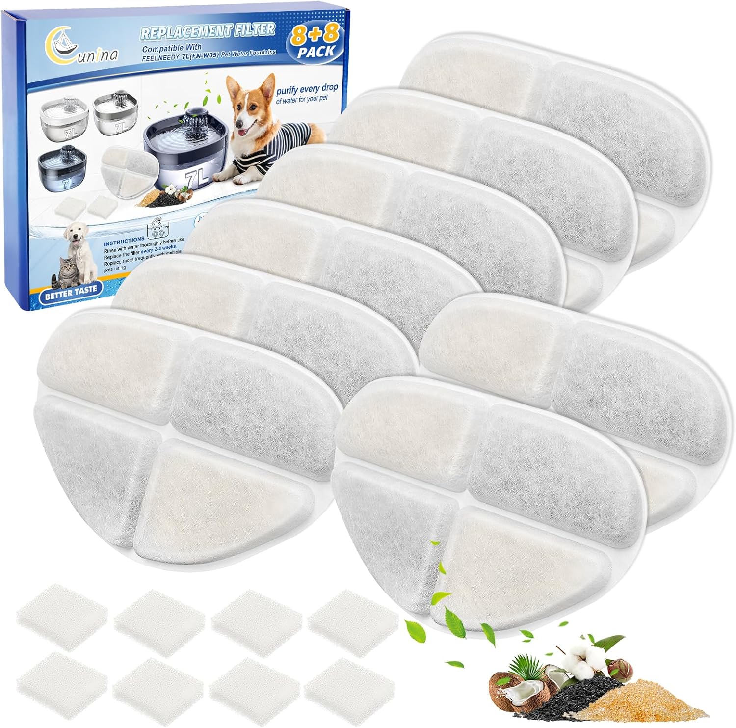 - VALUE PACKS: Include 8 packs of pet fountain replacement filters and 8 packs of replacement pump filter sponge compatible with feelneedy cat water fountain, satisfy your needs for long-time use