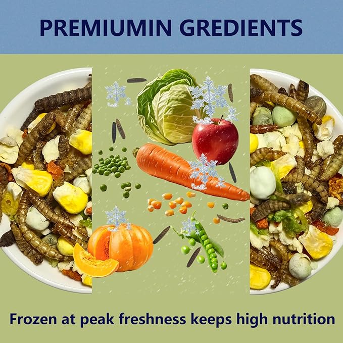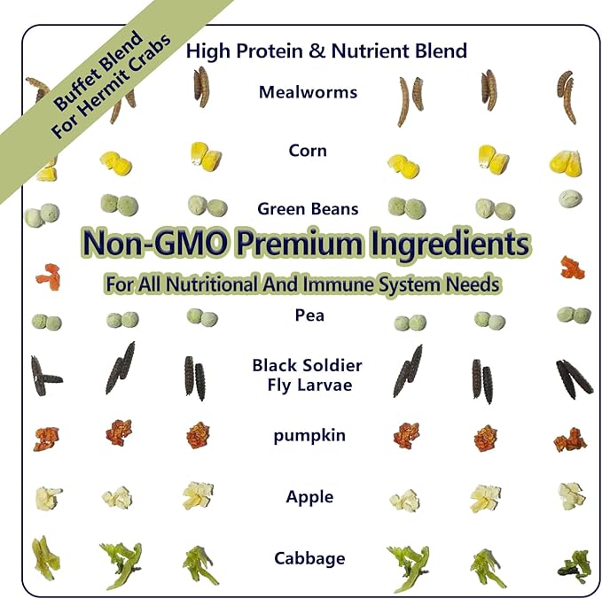 - All-Natural Ingredients: This variety diet is a unique blend of premium, non-GMO vegetable and mealworms, black soldier fly larvaea and an array of essential nutrients tailored to meet the specific needs of hermit crabs improving their immune system and overall well-being.