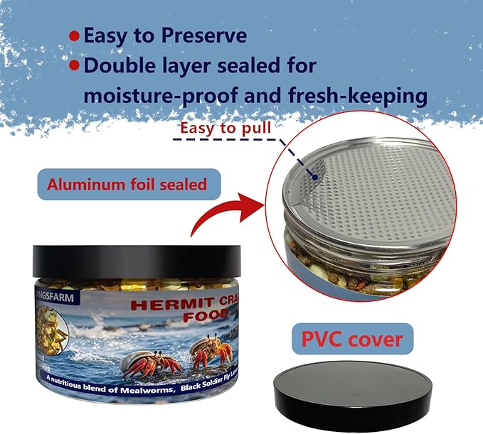 - Convenient and Long-lasting: Our 4 oz hermit crab food is packed with Aluminum foil double layer sealed jar to stay fresh and moisture-proof, offering a convenient and long-lasting supply.