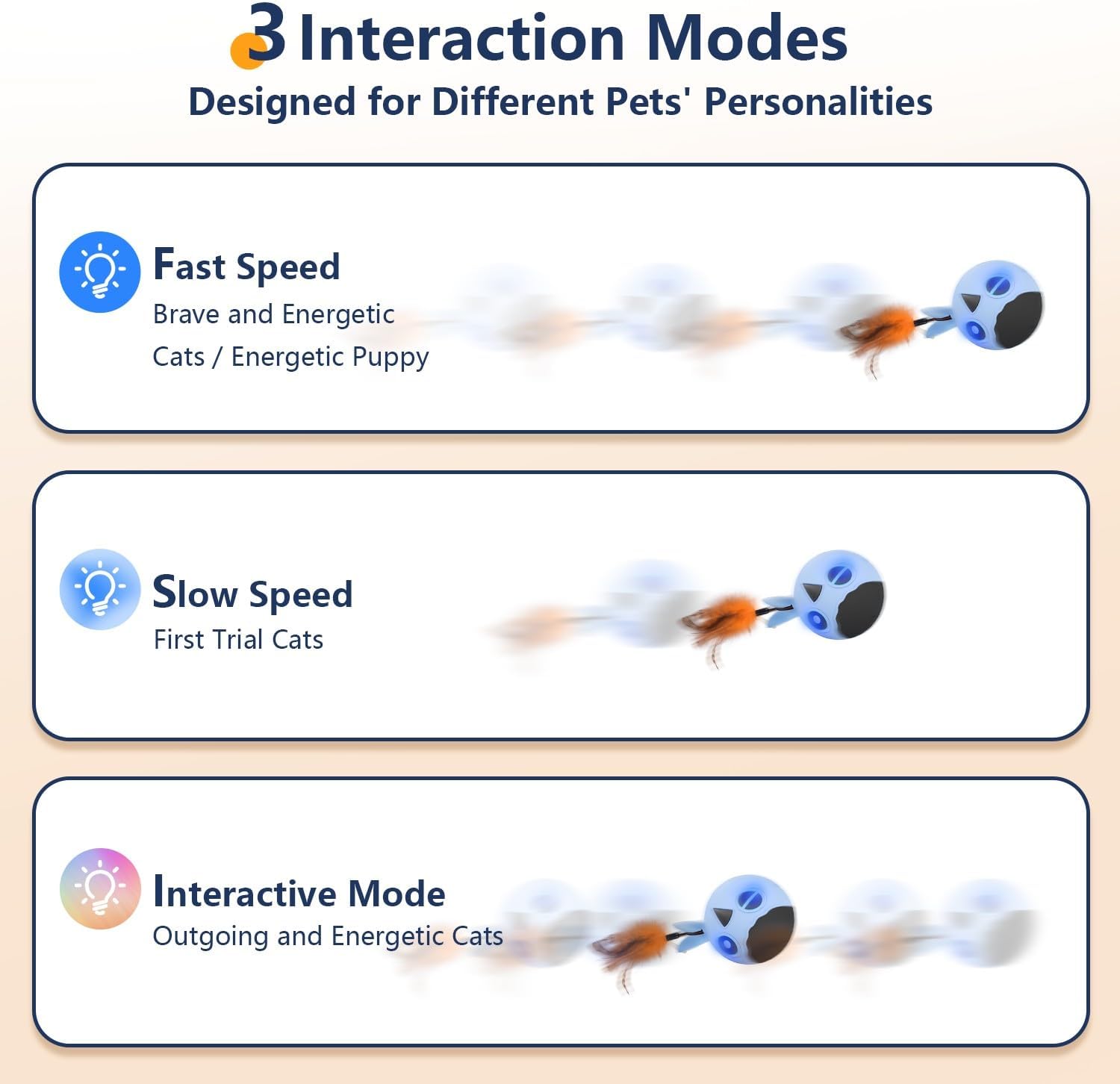 - ๐ฅCAT AFTER MOUSE GAME: Interactive cat toys ball with a teaser feather tail is shaken or swung in front of the cat, imitate the random movement of small animals, emit sounds and LED flashing attract cats' attention, prompting cats to chase, jump and run. let cats experience a "natural" game, enhance the sense of reality and satisfaction. Through fast and random movements, helping cats consume excess energy and stay energetic and healthy.