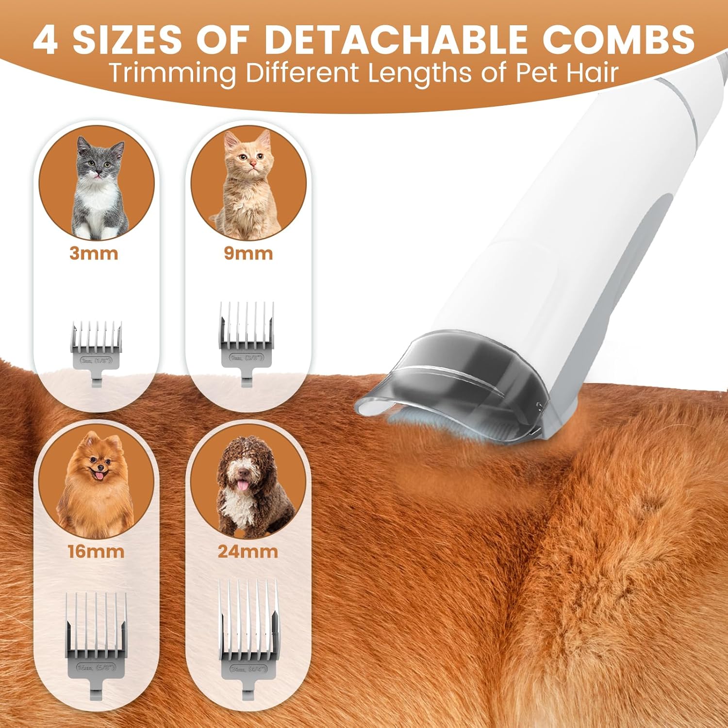 - 7-In-1 Pro Pet Grooming Kit: Rely on dog grooming kit for one-stop pet care and refine your pet’s life. Suction and grooming all in one. Electric clippers and sucking hair at the same time, effectively remove pet hair and fine dust and keep it neat. Dog paw trimmer and Nail grinder provide excellent cutting. Cleaning brush and Nozzle head brush for deeply clean, effectively sucking out loose hair and dandruff on the clothes, sofa crevices and carpet