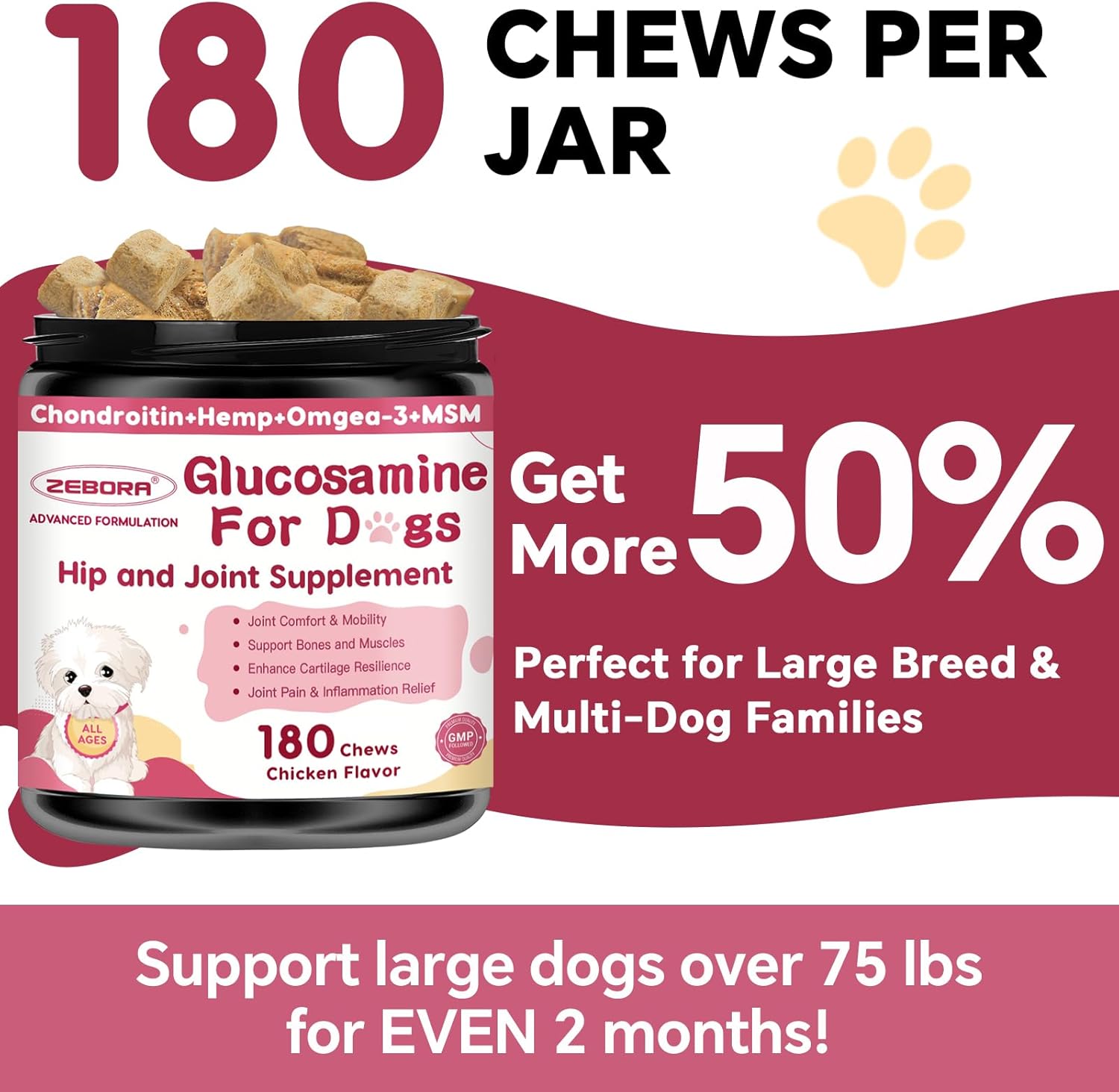 Glucosamine for Dogs - Joint Supplement for Dogs with Chondroitin, MSM, Omega 3, Hemp, Turmeric for Dog Joint Pain Relief, Dog Joint Supplement with Calcium Support Cartilage & Bone Health, 180 Chews