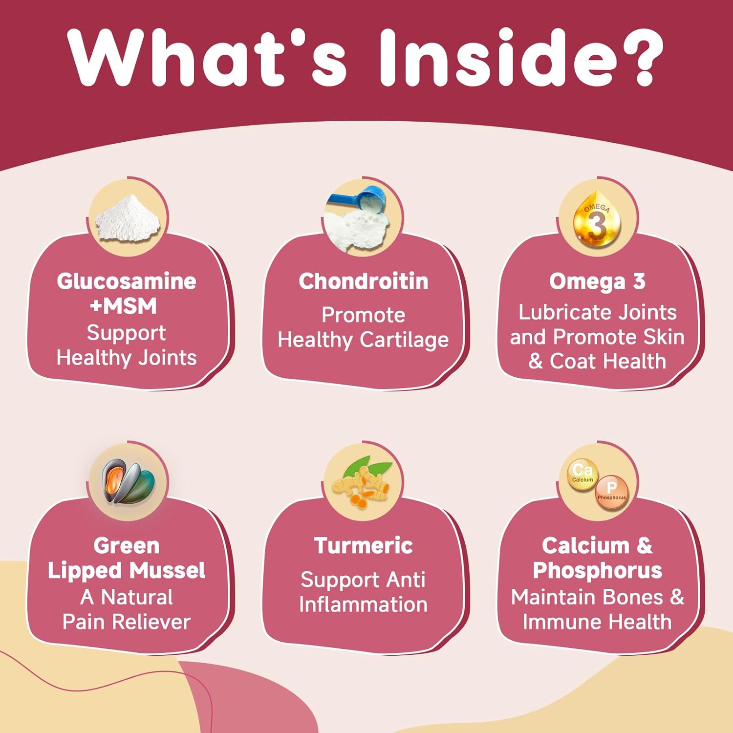 - Premium Joint Support: Our hip and joint supplement dogs contains glucosamine chondroitin for dogs to support healthy joints and cartilage, keep connective tissues resiliency, and MSM reduces joint discomfort caused by inflammation and support flexibility