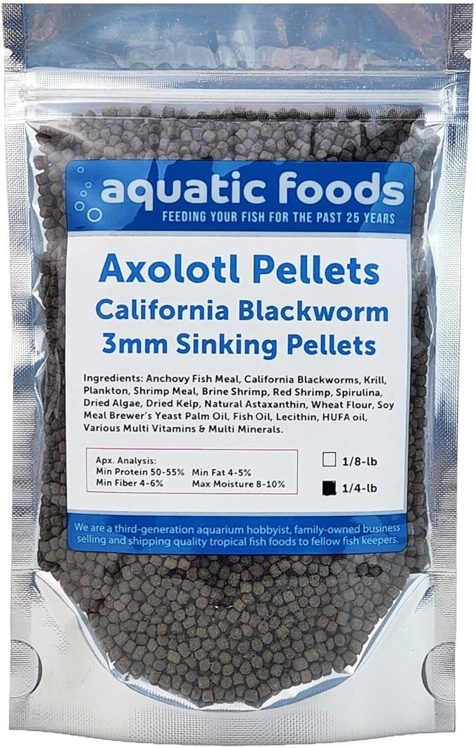 Aquatic Foods Inc. Axolotl Blackworm Pellets. 3mm-1/8 Sinking California Blackworm Medium Pellets for Medium/Large Axolotl, Frogs, Shrimp, Salamanders, Newts, Snails…1/4-lb Pouch Bag