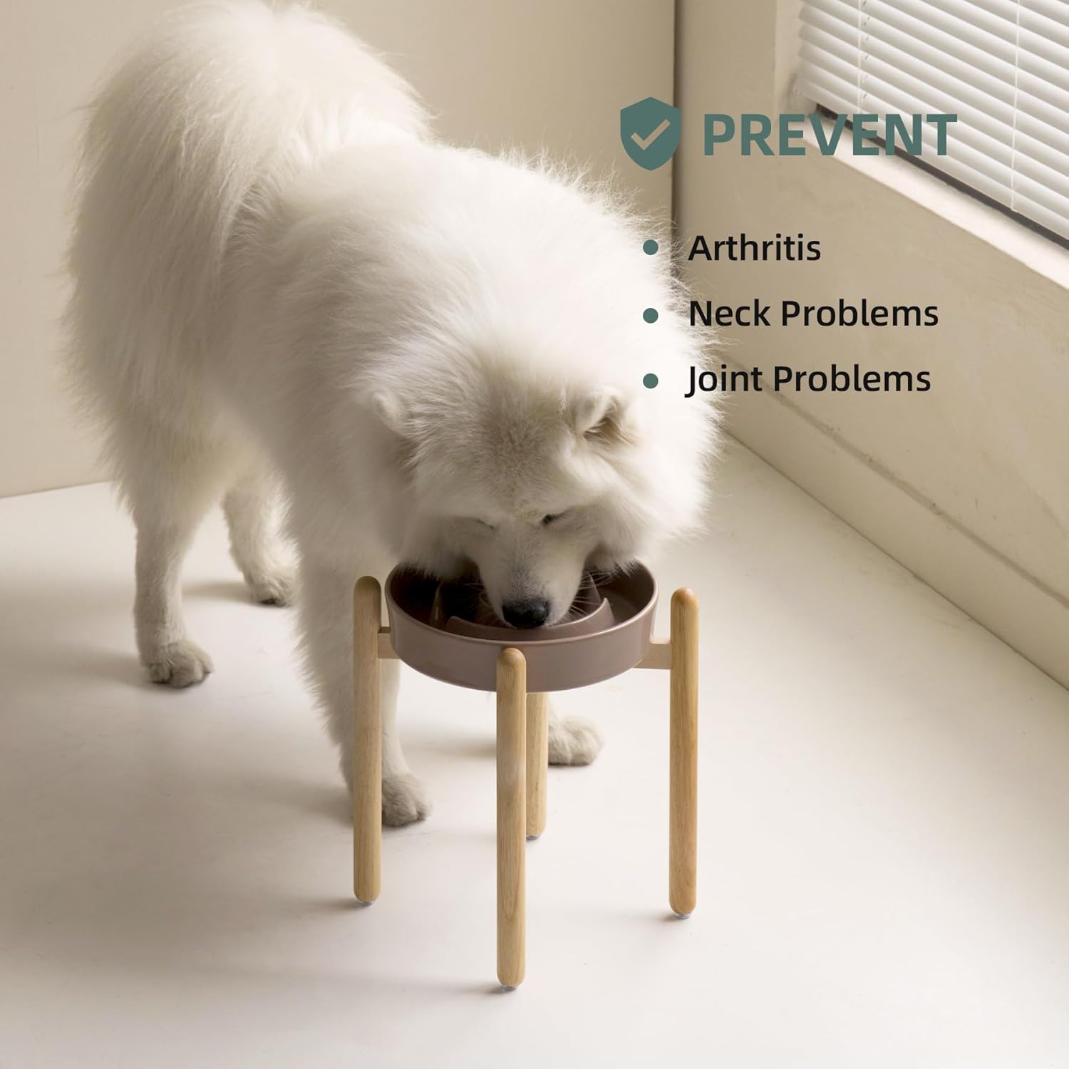 Ceramic 3.2 Cup Raised Slow Feeder Dog Bowl Set, Elevated Bowl with Wooden Stand for Large Dog, 9.5inch Puzzle Slow Pet Food Dish, Anti-Gulping(Brown Coffee, Single Bowl+ Stand)