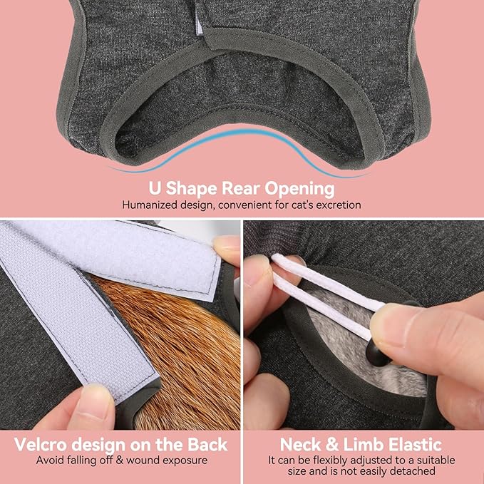 - 【Secure Fit and Easy to Put on】 Our cat surgery suit features adjustable neck elastic band and back velcro tape design, providing a secure and customized fit for your furry friend. Recovery suit for cats after spay can reduce the risk of escape or removal, and allow for easy adjustment to accommodate the cat's size and comfort.