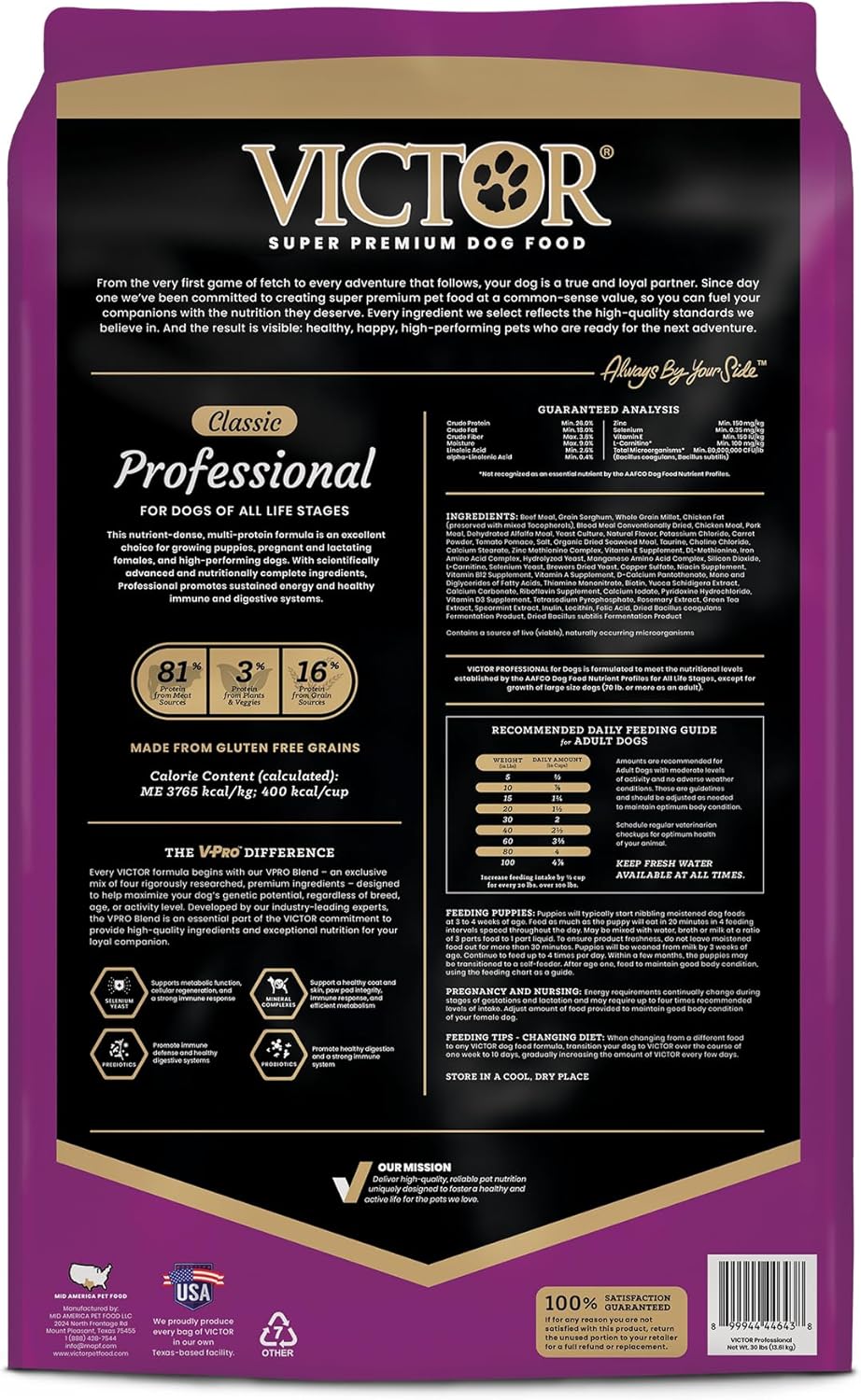 - PROFESSIONAL DOG FOOD: VICTOR Professional dog food is a gluten free, 26% protein kibble that has been popular with active and sporting dogs for years. This dog food keeps your pet active and vibrant, promoting their endurance and performance during all life stages.