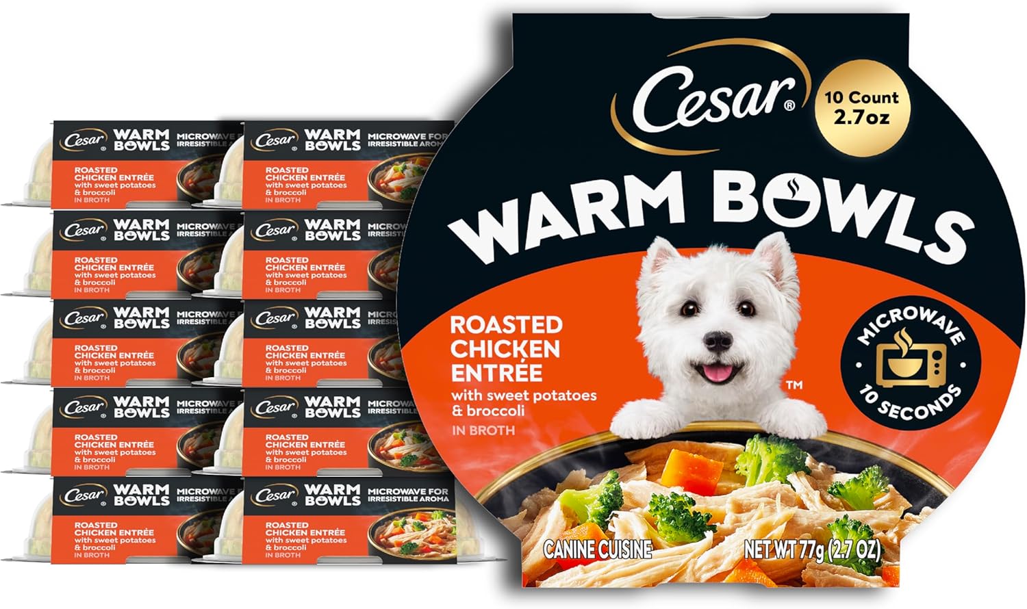 - Convenient Packaging: Cesar Warm Bowls Wet Dog Food Roasted Chicken Entrée With Sweet Potatoes & Broccoli In Broth’s packaging is designed to be mess-free in the microwave and easy for heating
