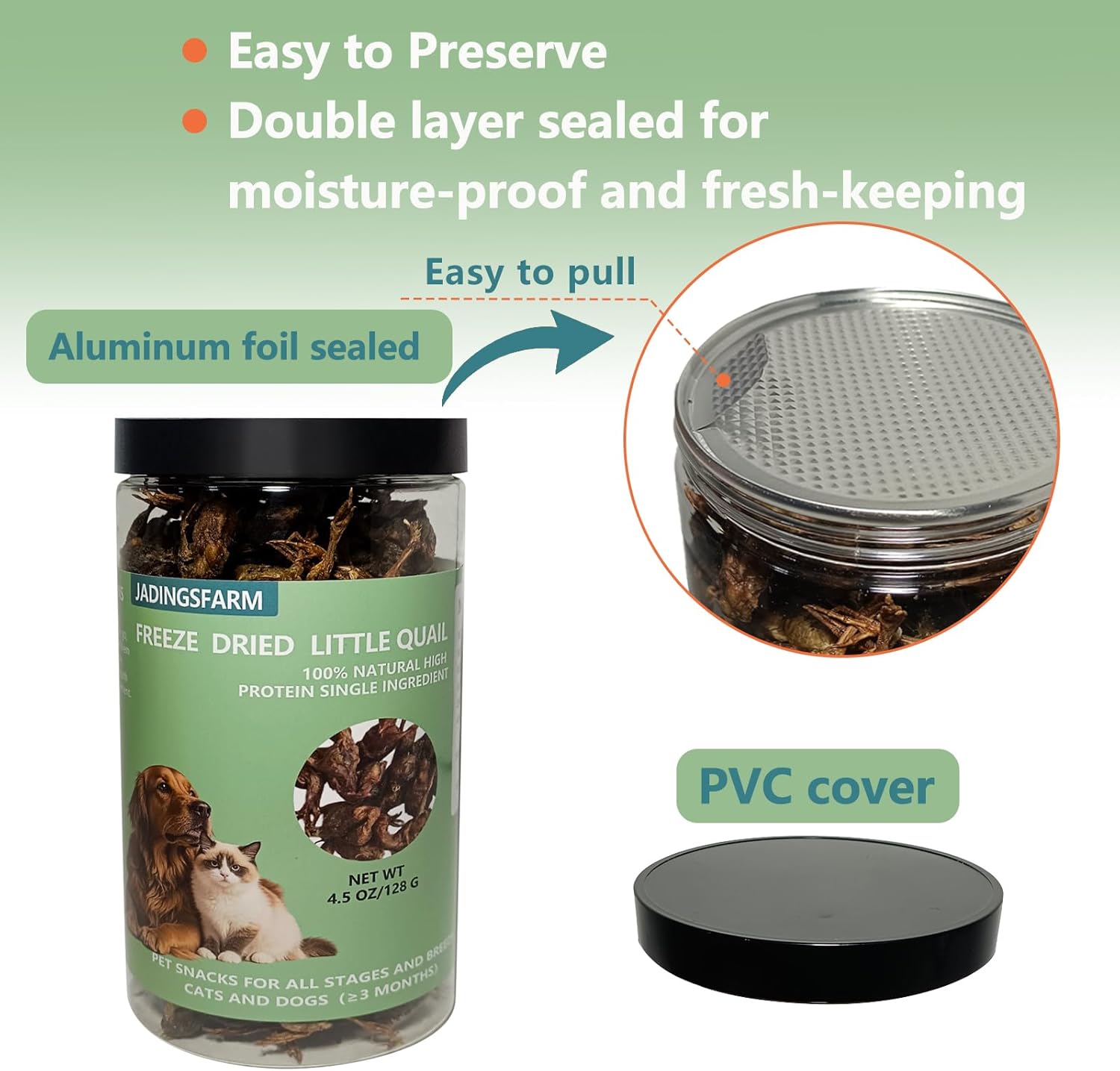 - Limited Ingredient Freeze Dried Quail: Jadingsfarm 100% natural premium freeze-dried little quail pet treat is rich in animal protein, providing a natural and healthy food option for your pets’ dietary needs