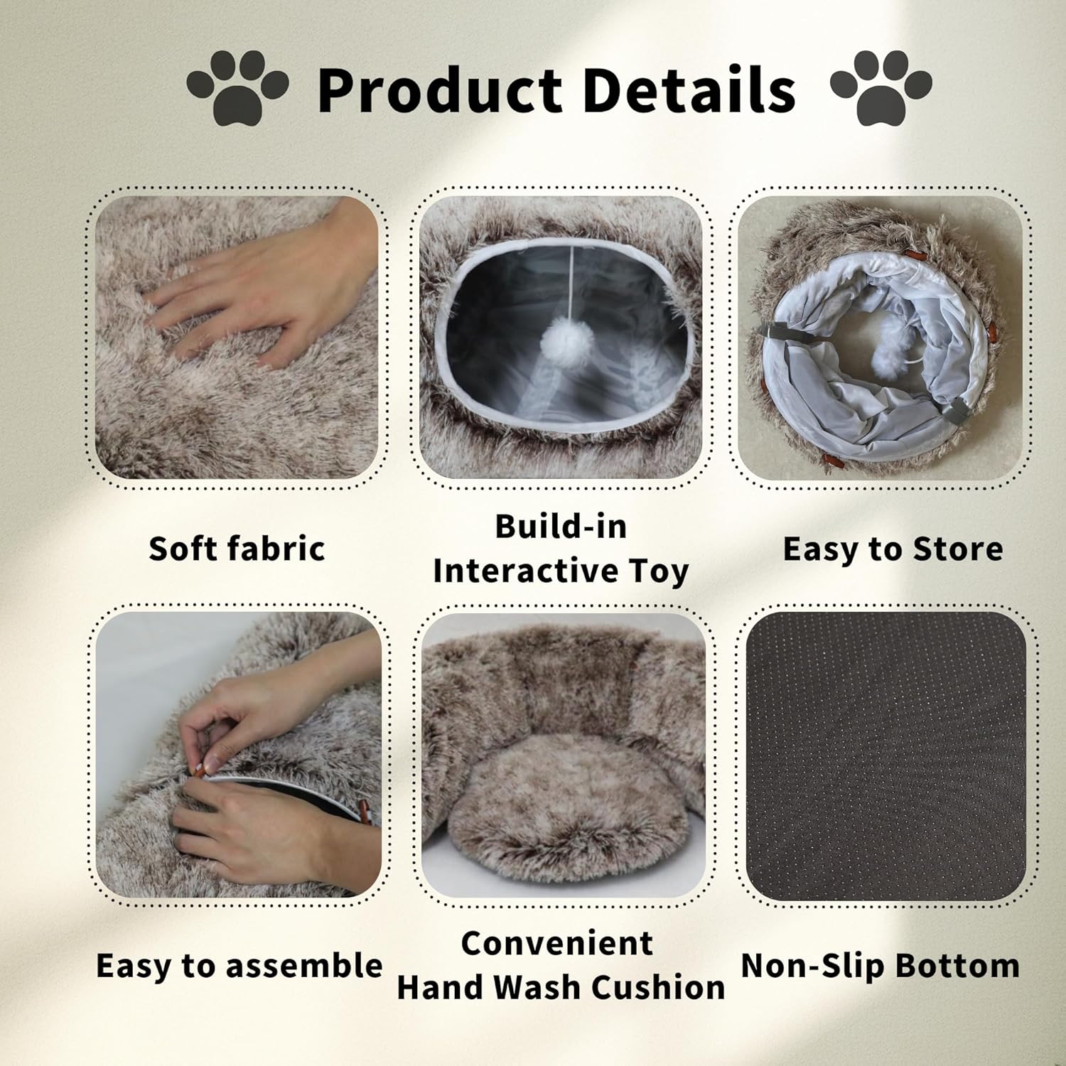Cat Tunnel Bed for Indoor Cats with Washable Cushion Cat Cave Donut Tunnel with Fluffy Ball Big Round Tube Pet Playground Toys Soft Plush Peekaboo for Kitten, Cat, Puppy, Rabbit, Ferret(Brown)