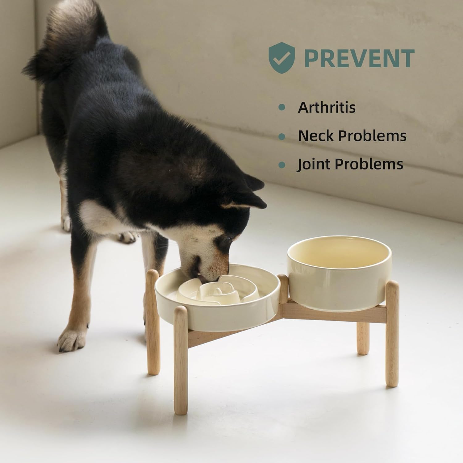 Ceramic 1.2 Cup Raised Slow Feeder Dog Bowl Set, Elevated 6.1inch Bowl and 7.3inch Puzzle Slow Food Dish with Wooden Stand for Medium and Small Dog, Anti-Gulping (2 x Beige+ Stand)