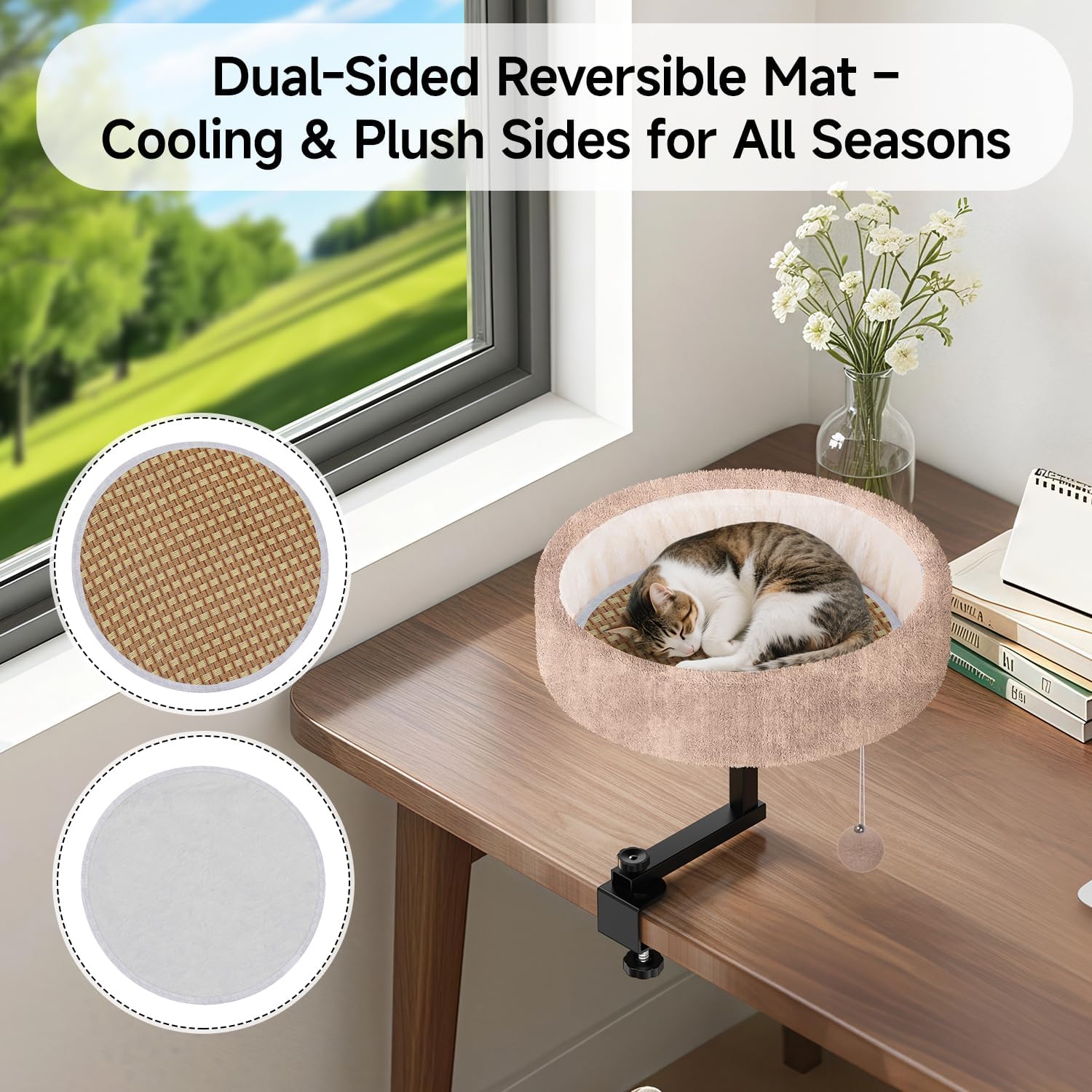 Cat Desk Bed - 360° Rotating & Adjustable, Supports 44 lbs, Soft Faux Fur with Dual-Sided Reversible Mat, Modern Indoor Cat Nest Furniture for Office Desks and Game Tables, Island Table