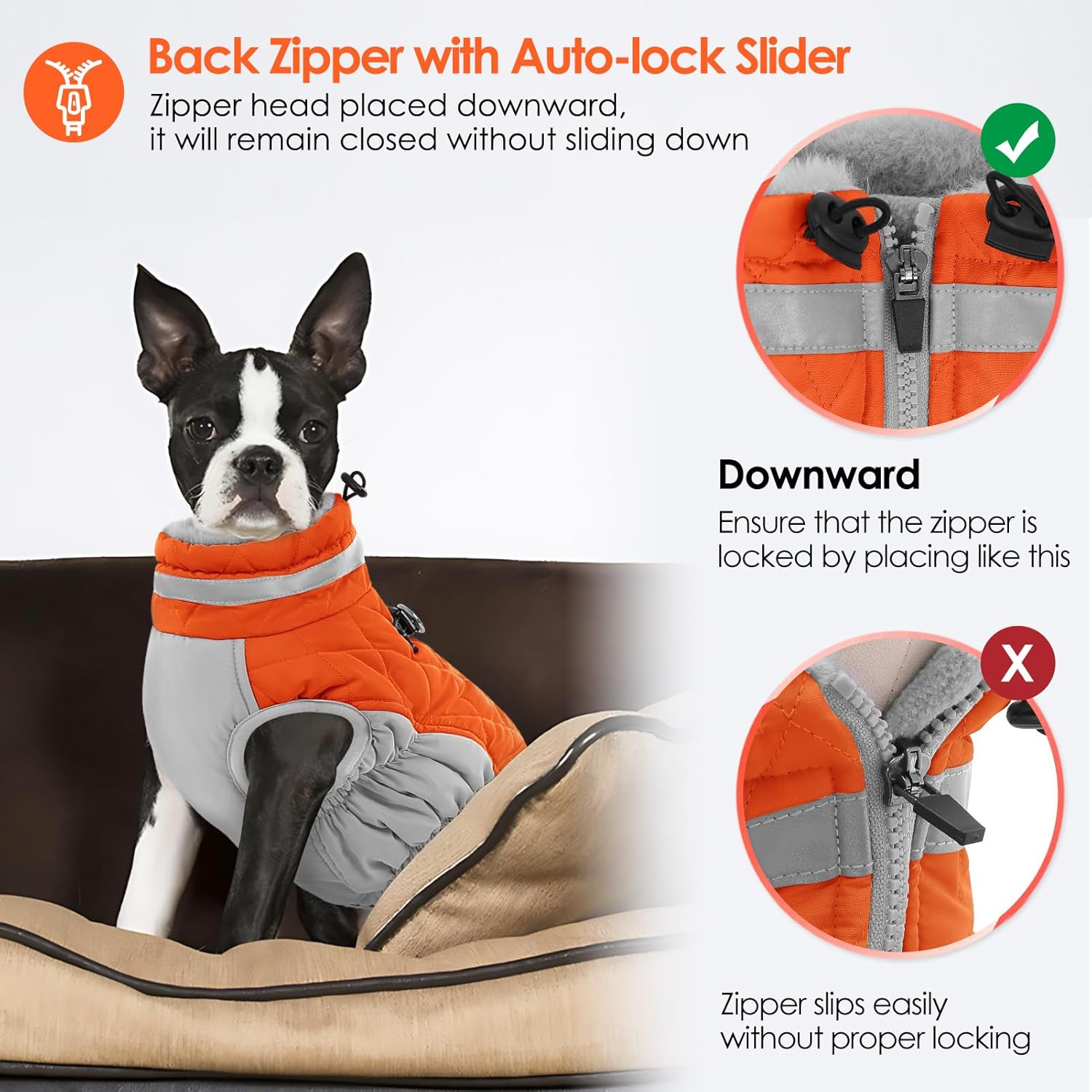 - ELASTIC ABDOMEN DESIGN, PAINLESS ZIPPER CLOSURE FOR EASY ON & OFF: The waterproof dog coat is equipped with zip on the back, elastic chest and sleeveless design, very easy to put on and take off. The protective Pain-Free Zipper Guard on the dog sweater prevents dog fur and skin from getting accidentally zipped