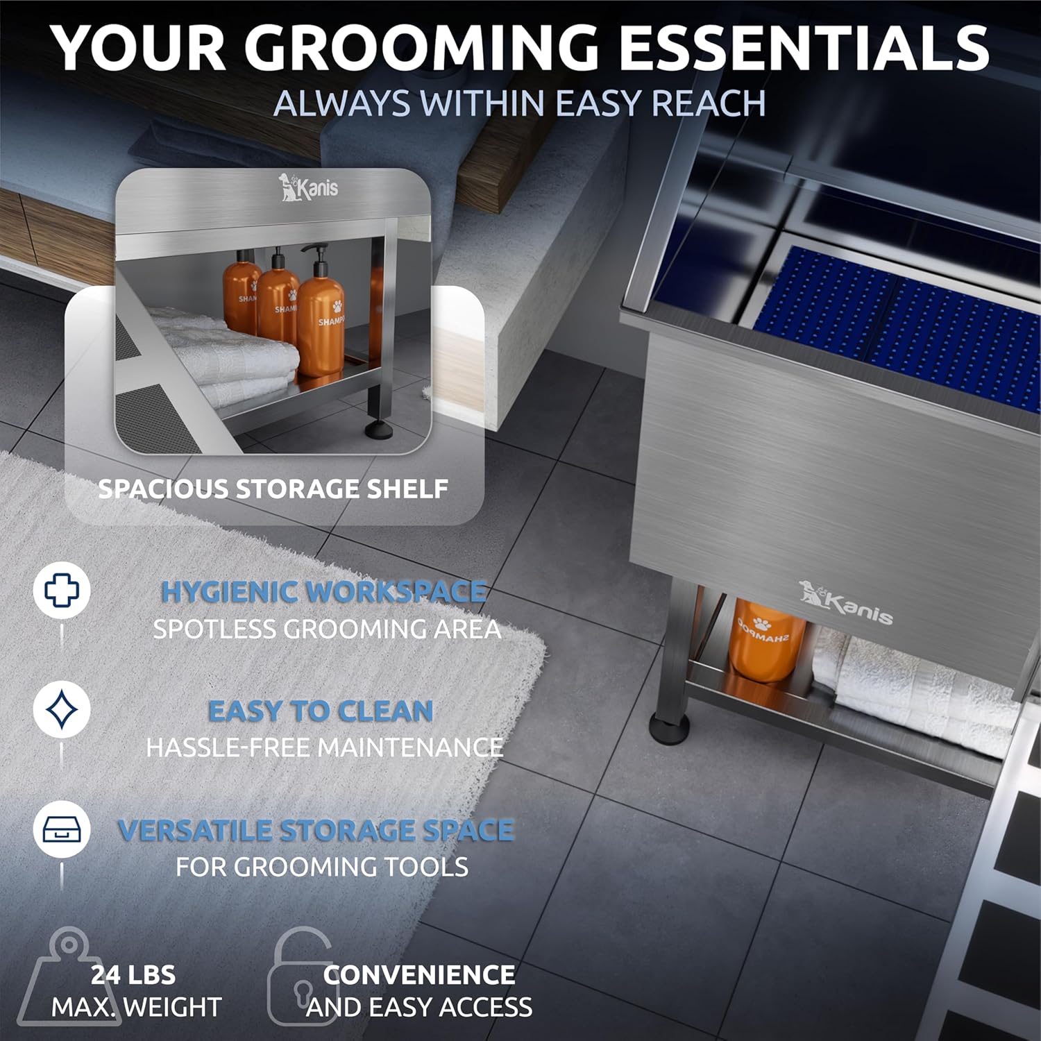 - SPACIOUS STORAGE & HYGIENIC SETUP: The storage shelf holding up to 24 lbs, provide generous space for grooming tools and accessories. Keep essentials within reach while maintaining a clean pet wash station with hassle-free upkeep