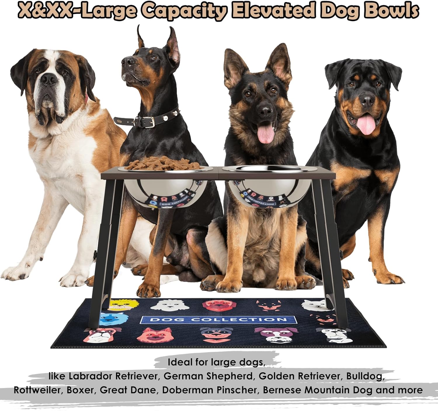 Elevated Dog Bowls for Large and X-Large Dogs, with Spill Proof Mat, 4 Heights Adjustable Wood Raised Dog Bowl Stand with Two Stainless Steel Food and Water Bowls, Non-Slip